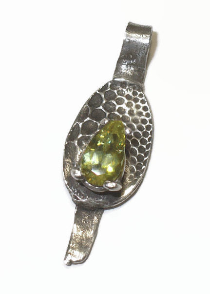 Natural Absinthe Sphene Titanite Pendant in Unique Fine Silver Pendant One-of-a-kind pendant features all-natural pear-cut sphene, set in a unique handmade pure silver setting. The beautiful, very fiery gemstone measures 5 x 9 mm, and weighs just shy of 1 ct. Pendant is handmade, from a mold derived from an absinthe spoon - very appropriate, for a gem that is truly absinthe colored! This yellow-green body color is sparked with flashes of red, blue, yellow, and green...truly a beautiful, untreated gemstone with incredible fire. Pendant, including self-bail, measures approx. 32 mm (1.25 inches) long, and comes with 18 inch sterling baby box chain.