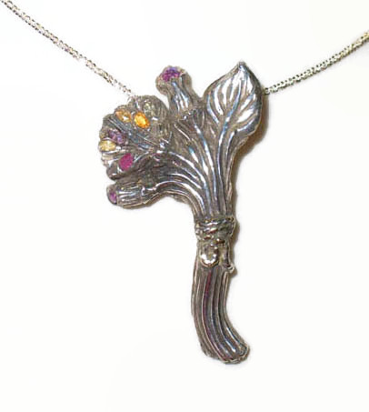 Solid silver bouquet in solid Piece is handmade, and carries maker's mark and silver proof mark. Pendant has a hidden bail, measures 2 1/8 inches tall, and comes with an 18 inch sparkling sterling silver chain.