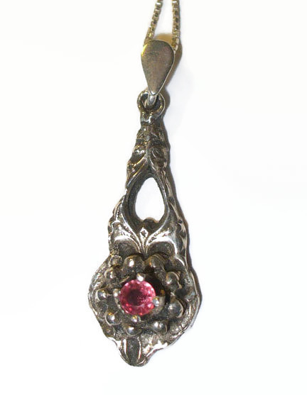 Entirely handmade pendant features a fine silver Victorian-look dangle, set with a 3.5 mm genuine ruby; suspended from a polished sterling bail and suspended from an 18 inch solid sterling baby box chain. This is a one-of-a-kind piece, finished with a wonderful patina. Overall measures 33 mm long.