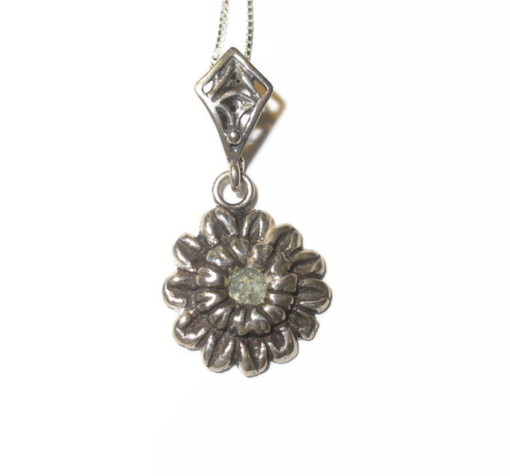 Delicate Blue Genuine Sapphire Flower Pendant In Fine Silver Pendant Handmade pendant features a fine silver flower dangle, set with a pale blue genuine sapphire; suspended from a fancy sterling bail and hung on an 18 inch solid sterling baby box chain. The 16 mm diameter fine silver flower is completely handmade in our studio here, and is set with a 4 mm genuine blue sapphire. This piece is executed in fine (.999) silver, and is finished with a wonderful subtle patina. Pendant, including bail, is about 30 mm (1.25 inches) tall.