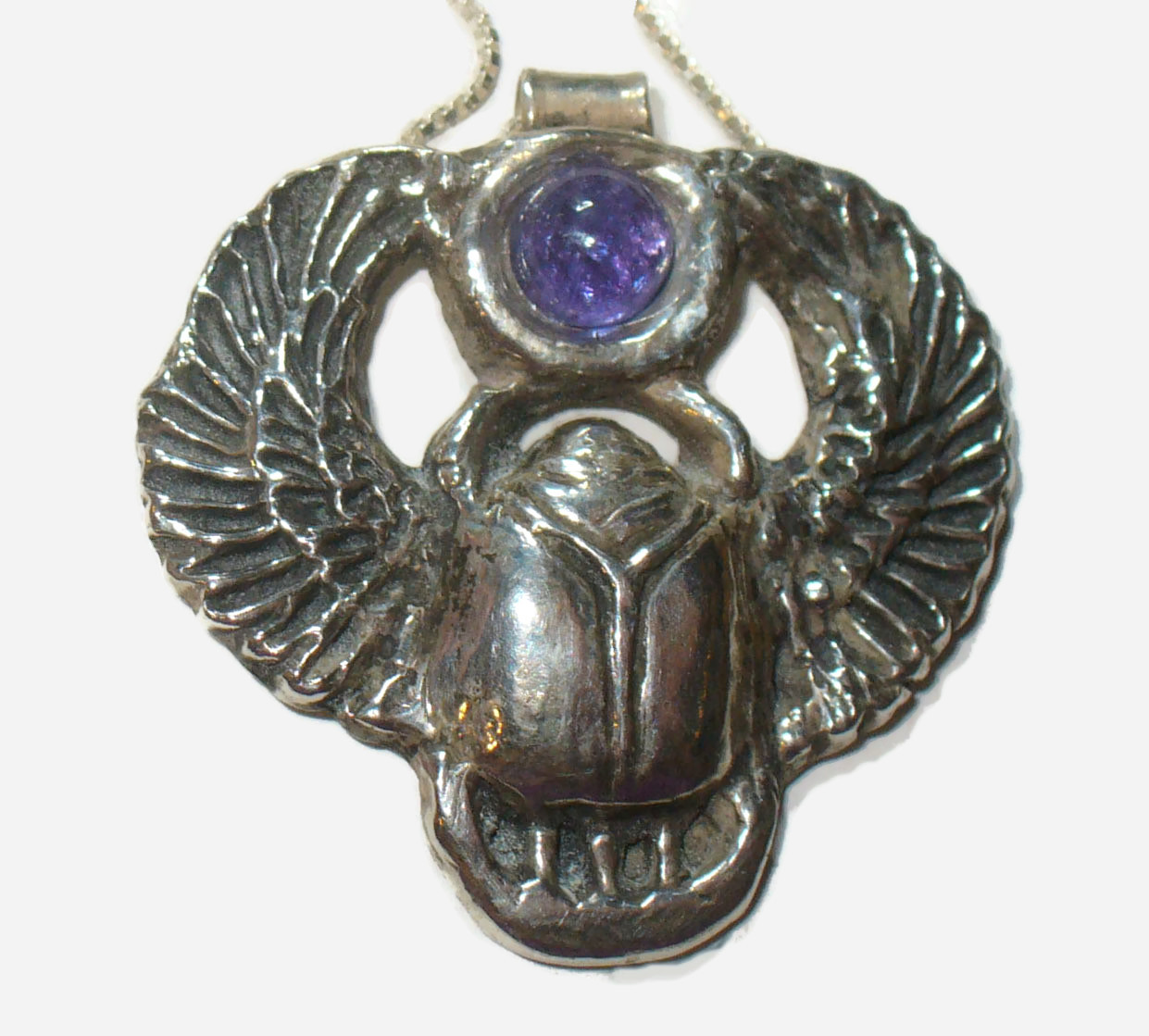 Egyptian Winged Scarab Necklace Winged Egyptian scarab pendant in solid PURE silver is a breath-taking substantial piece of jewelry, set with a genuine natural 7 mm tanzanite cabochon. Piece is entirely handmade by us, and carries makers mark and silver purity (.999fs) mark. Regal creature measures 35.5 mm x 37 mm. Fine silver scarab has been antiqued to enhance detail. An 18 inch baby box chain is included. Fine silver is finer and purer than sterling. The scarab beetle is an ancient Egyptian symbol of life and fortune. While we can't promise long life, fortune, or special energy, we do guarantee you'll be delighted with this handmade silver piece! Price: $275 US shipping included