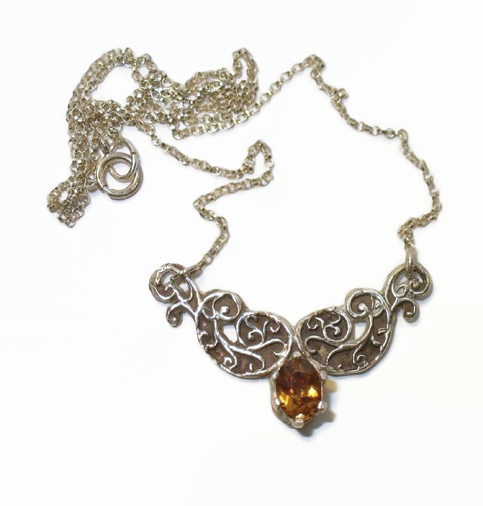 Genuine Golden Zircon in Sterling Silver Necklace Sparkling genuine zircon highlights this gorgeous handmade center-piece style sterling necklace. Not to be confused with manmade cubic zirconia, zircons are natural mined-from-the-earth precious gemstones. The prong-set gem is VS clarity, measuring 7 x 5.25 mm; and weighs 1.1 carats. Overall length of necklace is 18 inches. Price: $100 US shipping included
